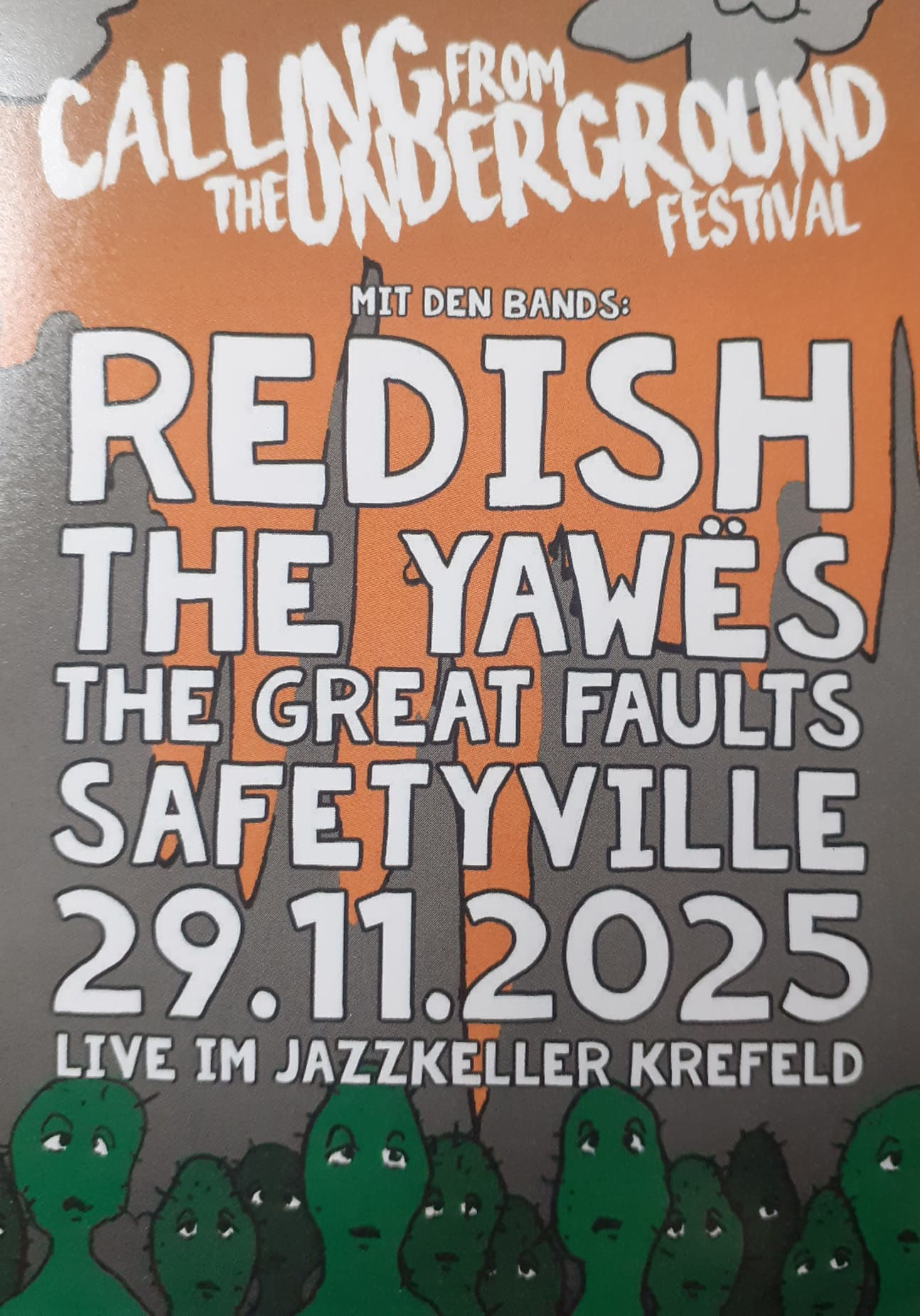 Safetyville: Wellness Pop aus Köln The Great Faults: Garagen-Soul aus Mülheim The Yawës: 90’s Indie-Schrammel-Rock aus Krefeld Redish: Indie Rock aus Krefeld