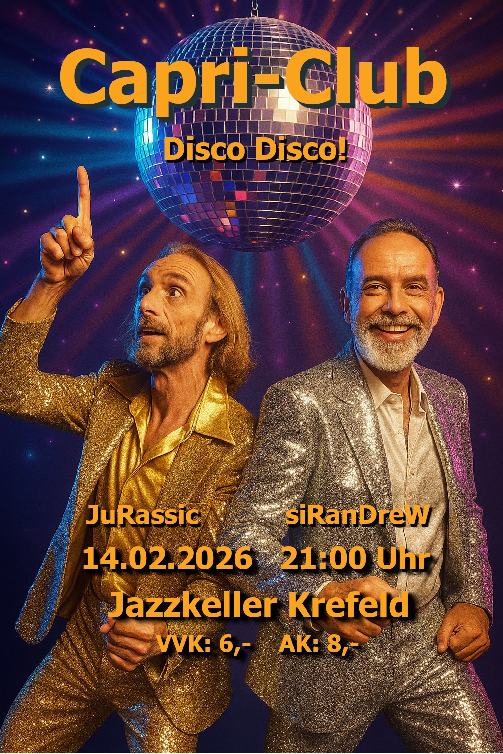 Von Funk-Ikonen bis zu den großen Disco-Klassikern – wir bringen das Lebensgefühl einer Ära zurück, in der Plateauschuhe, Schlaghosen und Discokugeln regierten. Egal ob du die 70er selbst erlebt hast oder einfach gute Musik liebst: Diese Nacht steht ganz im Zeichen von Groove, Glamour und guter Laune.